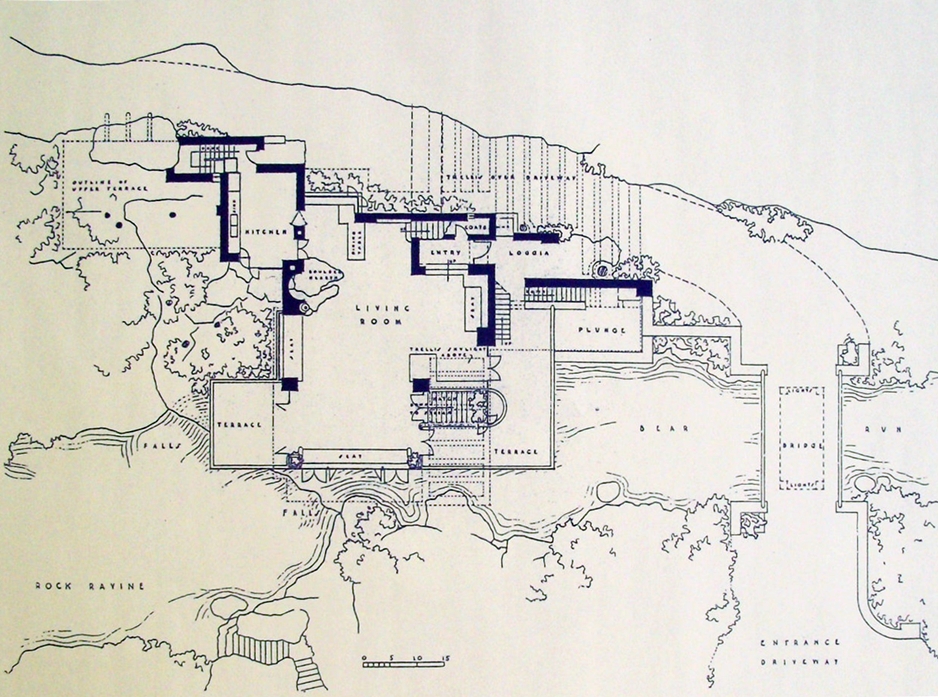 Wright seemingly sat on the design creating no drawings or even doing outlines on the site plans. The day came when the Mr. Kaufman called the fellowship to alert them that he would be in the area and would love to see the progress on the plans. As told by fellowship member Edgar Tafel, Wright literally sat at the drafting board and immediately began sketching out floor plans, elevations, and even a small perspective view. Once Mr. Kaufman arrived; Wright showed him what he had on hand and then took him out to lunch so the apprentices could do the finish work!