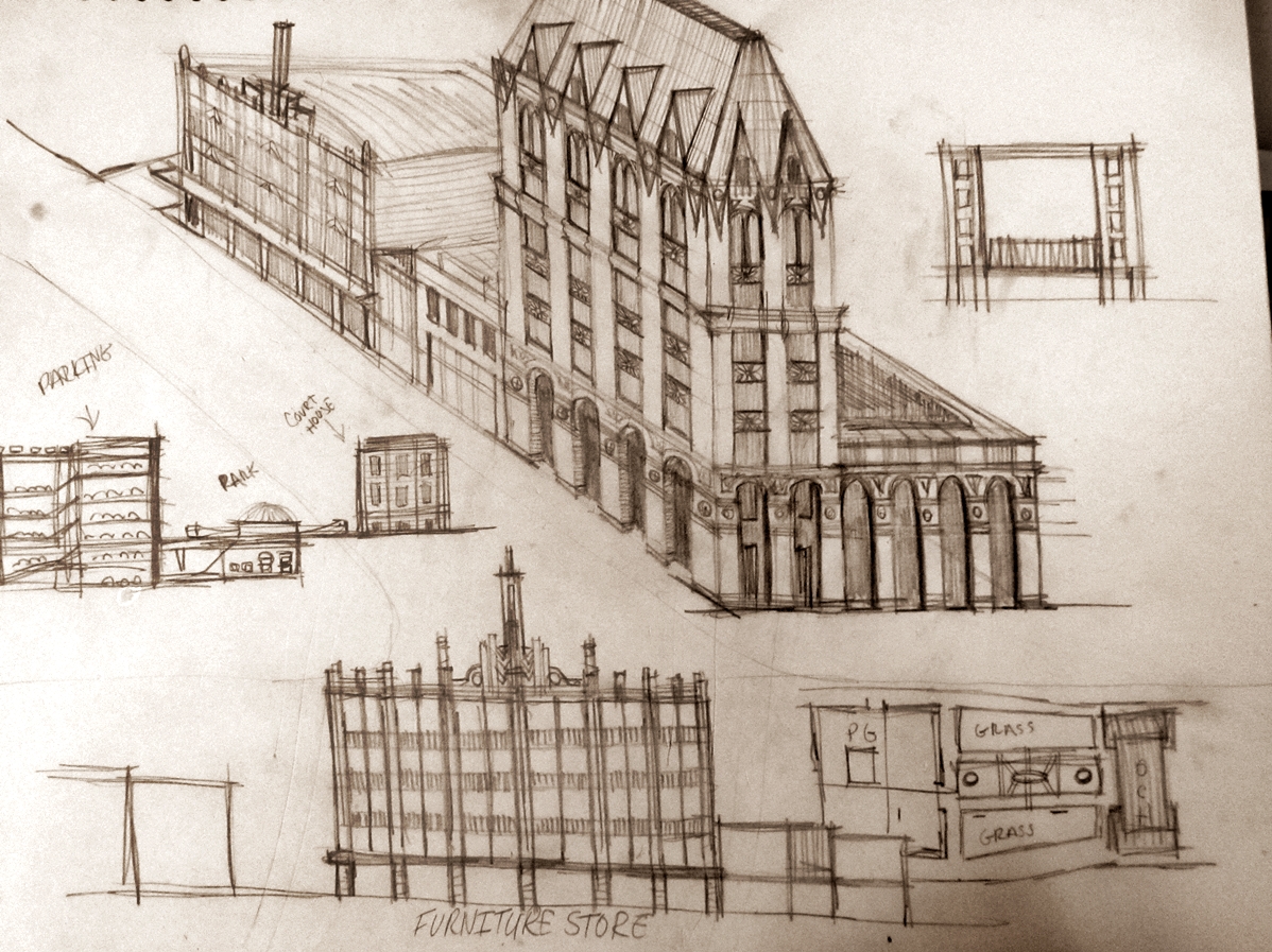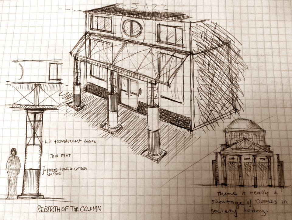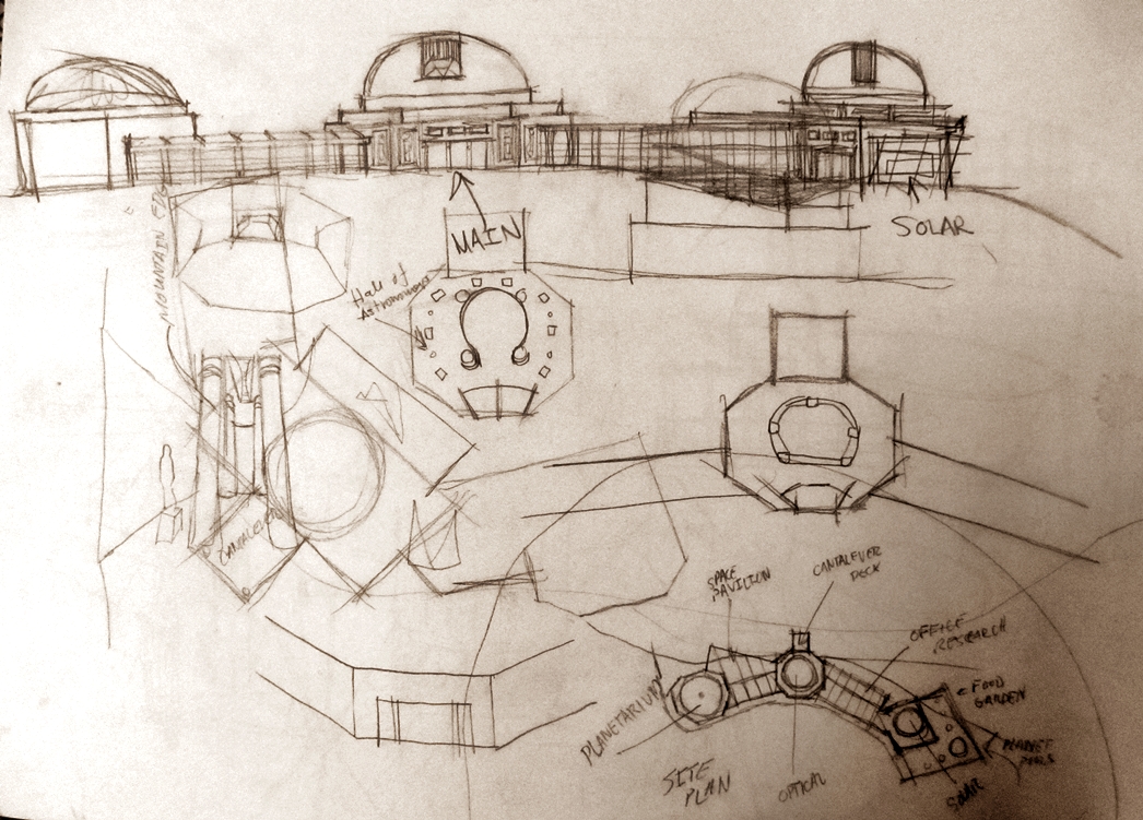 A concept involving glass and steel framed columns with internal illumination.A large governmental building, usable as a state capitol or grand city hall.Hotel concept.“Slim-Line House”, large living room with punched copper frieze and large windows.“Mushroom House,” springs out of the ground like a midsummer shroom’, below ground level entrance.Large scale observatory/museum.“Seaside House.” Large home overlooking the Pacific Ocean.Rear showing the small boat dock on the ocean.A sketch showing a possible remodeling of the main street in Mount Vernon, WA.