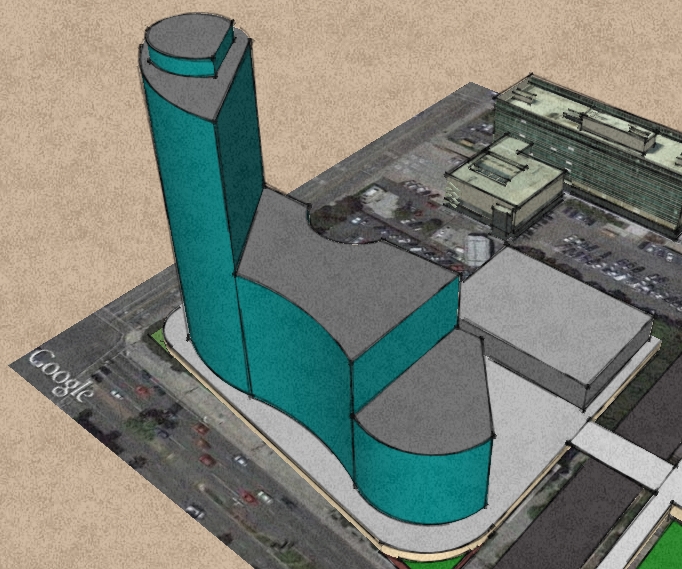 The Port of Long Beach gets it’s own major tower, designed to reflect the flowing curves of the Pacific ocean swells. Additional floor space can be rented out to other companies. I would incorporate a large above ground parking garage as well as an underground space under the city hall complex.