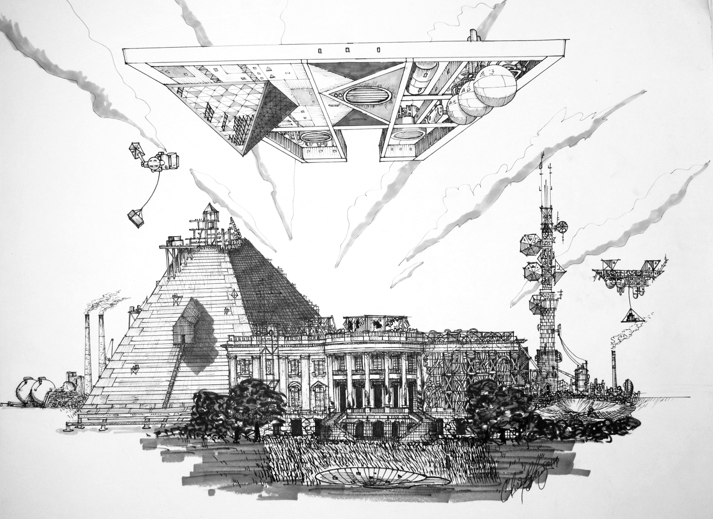 The skies were yellow, the rain more like a mist of diluted hydrochloric acid than water. As we walked over the small hilly rise, below us was the panorama of what used to be Washington, DC. The monuments had been mined for their limestone and great pits were dug into the National Mall. Miles of piping and dingy scaffold flocked around us, a pyramid of uncertain origin was being constructed near the White House. In the sky floated alien platforms and with a roar overhead crawled some indescribable combination of refinery and aircraft carrier. What had happened here?