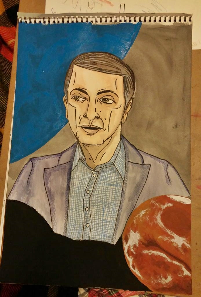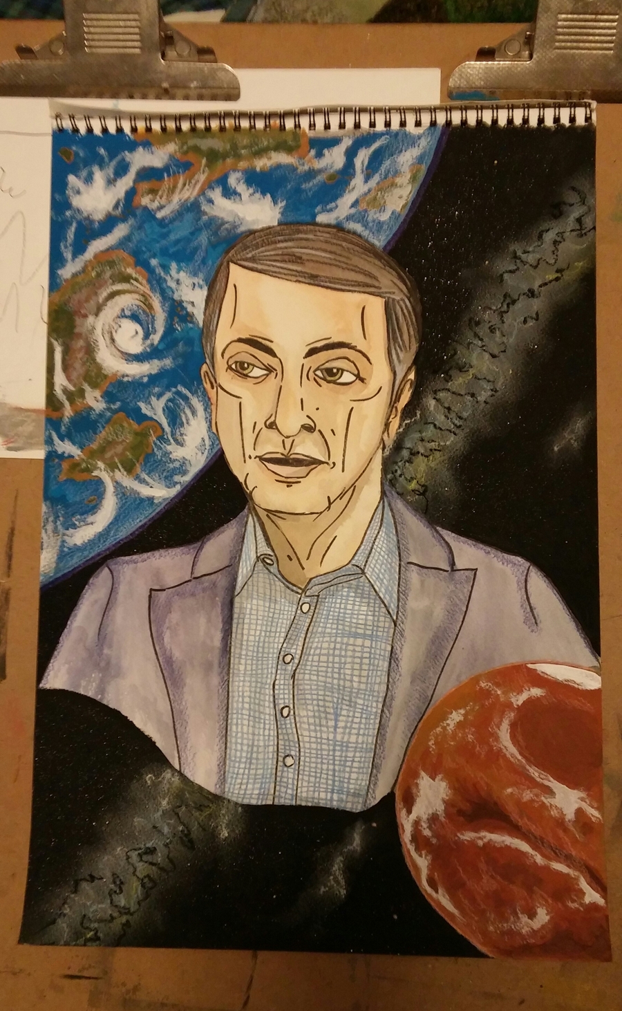 I enjoy portraiture, though often they end up being more caricatures than perfect likenesses. This is a multi-format painting done with Japanese ink, watercolor, color pencil, pastel, and acrylic paints. The subject is Carl Sagan in the middle of speaking to someone(s). Here is our pale blue dot the Earth and in the foreground, Mars.